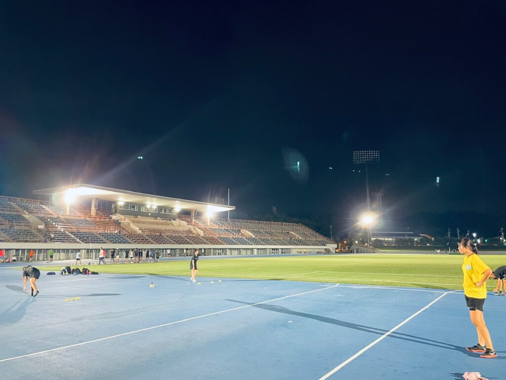 雷が鳴っていたので軒下で練習しました。スタートから10歩までの動きしかしていませんが、いい形でスタートをできるようになってきていると思います。明日からから世界陸上も始まりますし、世界トップ選手の動きをしっかりみて自分の競技に役立ててください。(西川談)